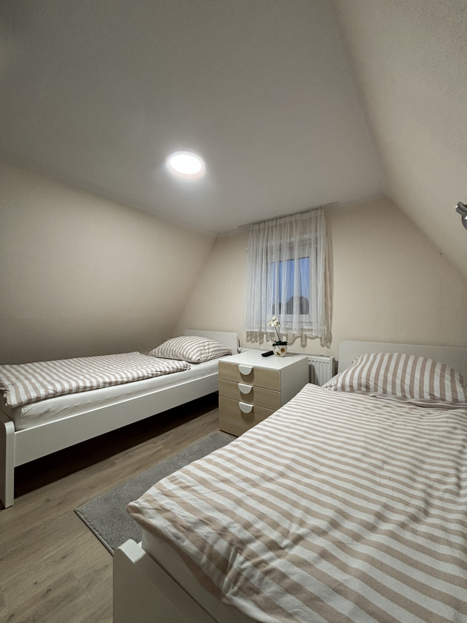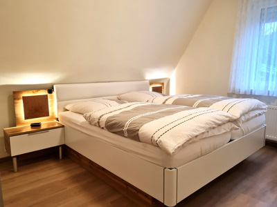Mit Doppelbett, mit guten Nachtschränken und 2 Stühlen, die mal notfalls am Esstisch zustellen kann.