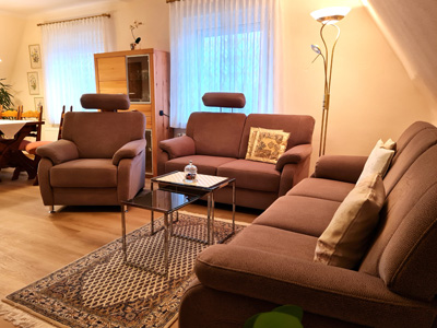 Machen Sie es sich in unserem gemütlichen Wohnzimmer bequem und genießen Sie eine entspannte Auszeit. Die große, bequeme Sofalandschaft lädt zu entspannten Stunden ein, ob bei einem guten Buch, einem Glas Wein oder einem gemütlichen Filmabend mit Netflix. Hier können Sie nach einem erlebnisreichen Tag die Füße hochlegen und einfach abschalten.
