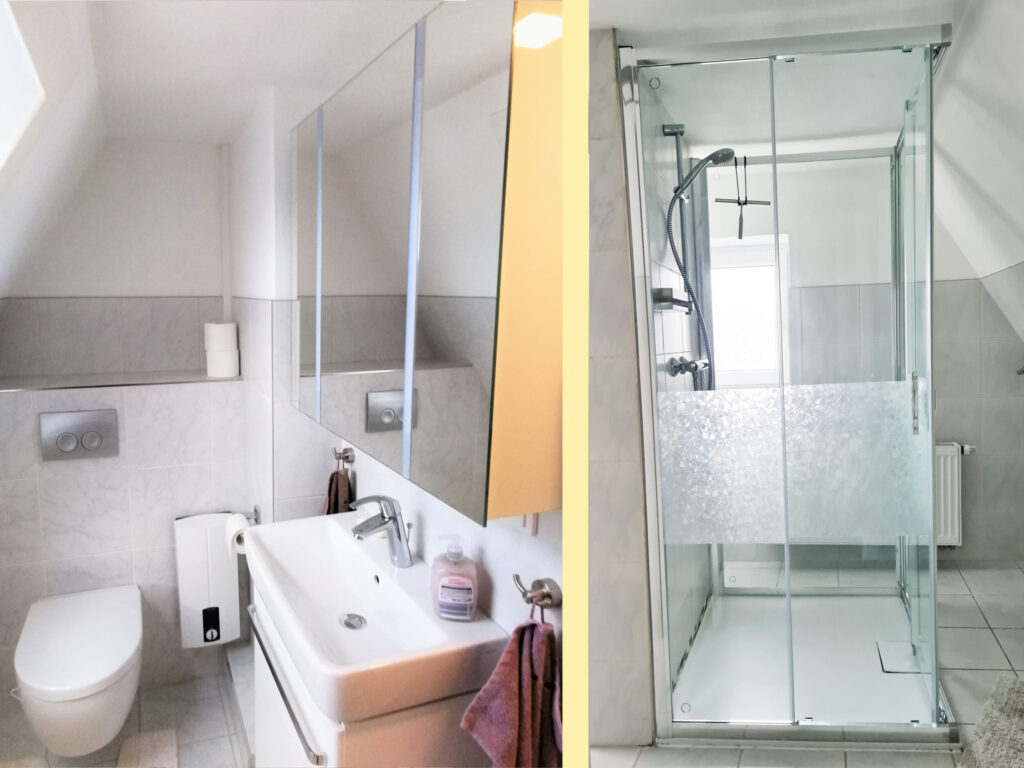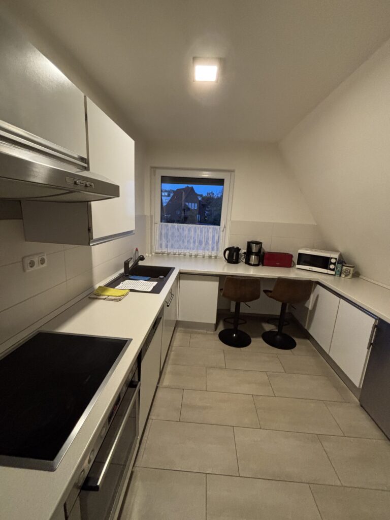 Die Ferienwohnung ist frisch renoviert und verfügt über 2 Schlafzimmer mit jeweils einem Doppelbett, ein Duschbad mit Waschbecken und WC sowie einer Einbau-Kommode mit Schubladen für Wäsche, ein Gäste-WC, voll eingerichtete Küche mit allen E-Geräten und 2 Hockern, ein großes Wohn-Esszimmer, Diele mit Garderobe und Schuhschrank.